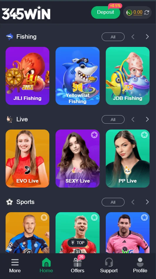 - Variety of Games: Slots, live games, sports, fishing, and more.